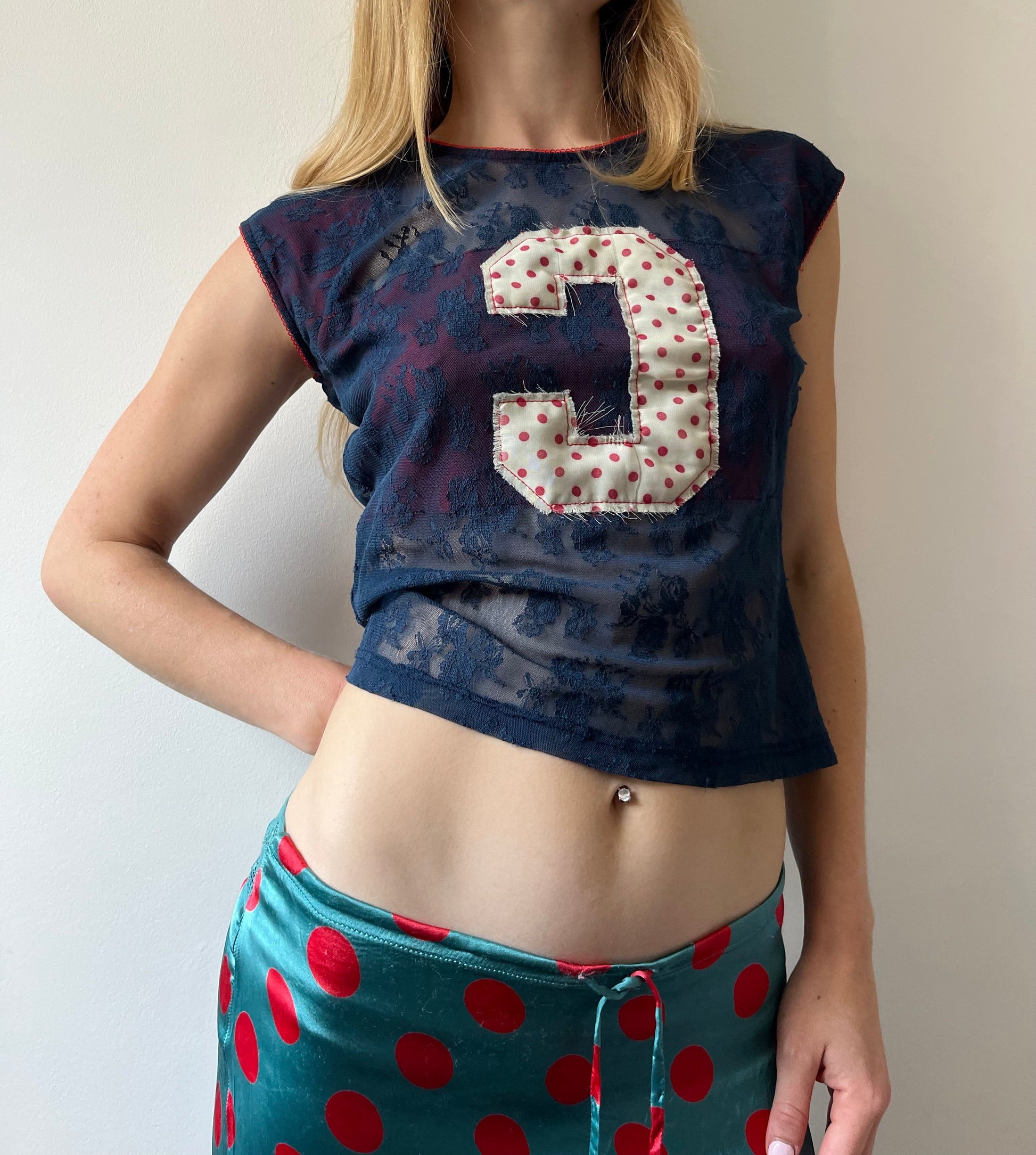 Italian designer mesh lace short sleeve polka top